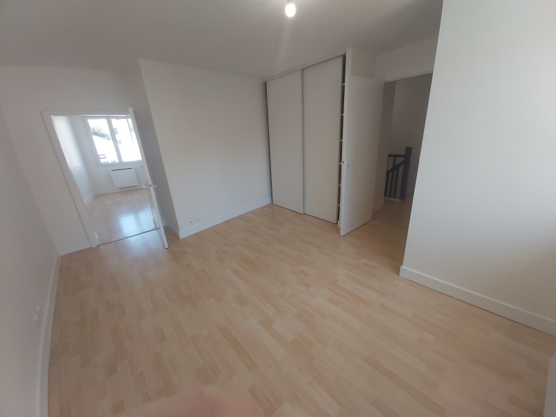 A l'étage : palier avec placards, une chambre avec placards communiquante à une deuxième pièce pouvant servir d'une petite chambre ou bureau (~ 7 m²), salle de bains, wc séparé.